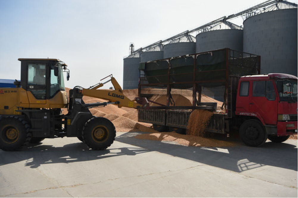 ↑3月12日,在托克托工业园区内的内蒙古融成玉米开发有限公司,工人操作设备卸载玉米原料。新华社发(李志鹏摄)