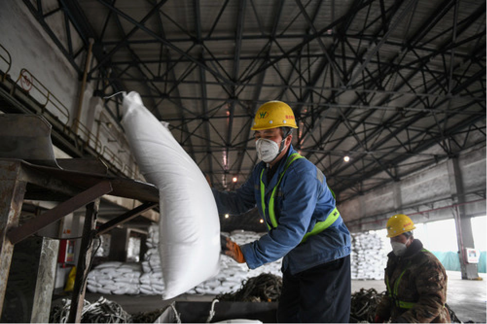 ↑3月14日,工人在内蒙古恒业成有机硅有限公司仓库装卸有机硅产品。新华社记者彭源摄