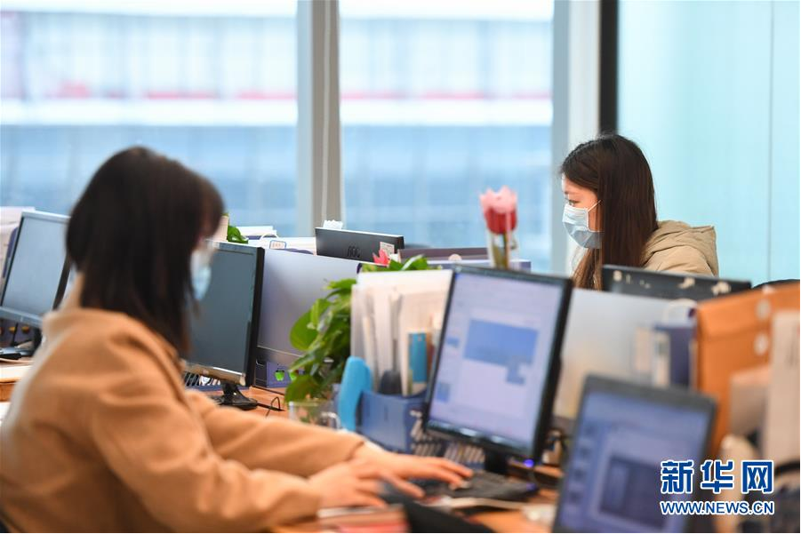 3月9日,在长沙市岳麓区楷林国际大厦,复工人员在办公。新华社记者 陈泽国 摄