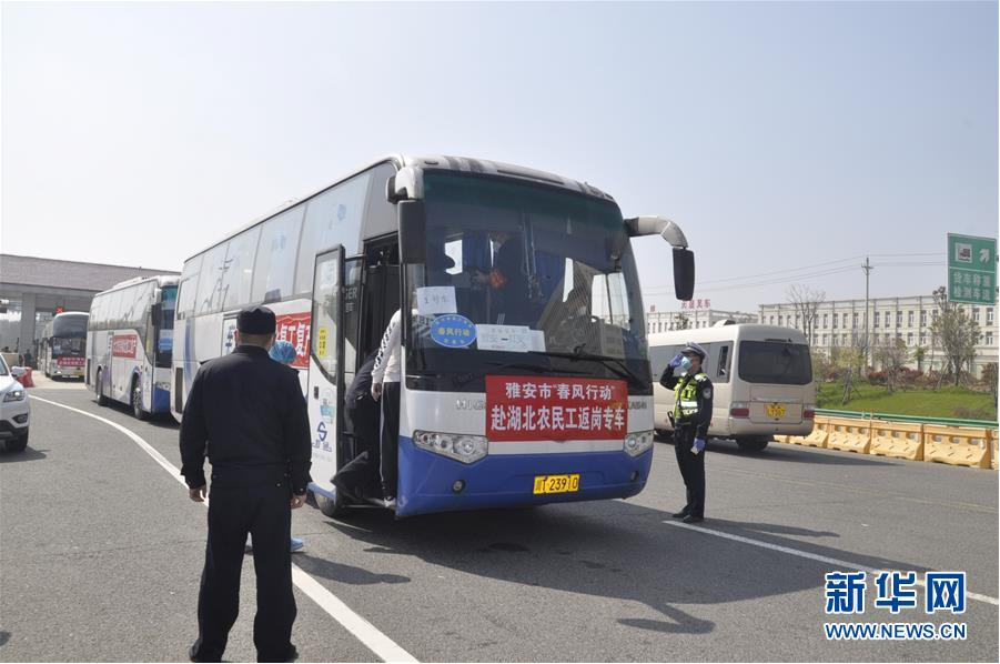 3月18日,四川省雅安市芦山县出发的送工专车车队到达湖北境内的武麻高速红安收费站。新华社发