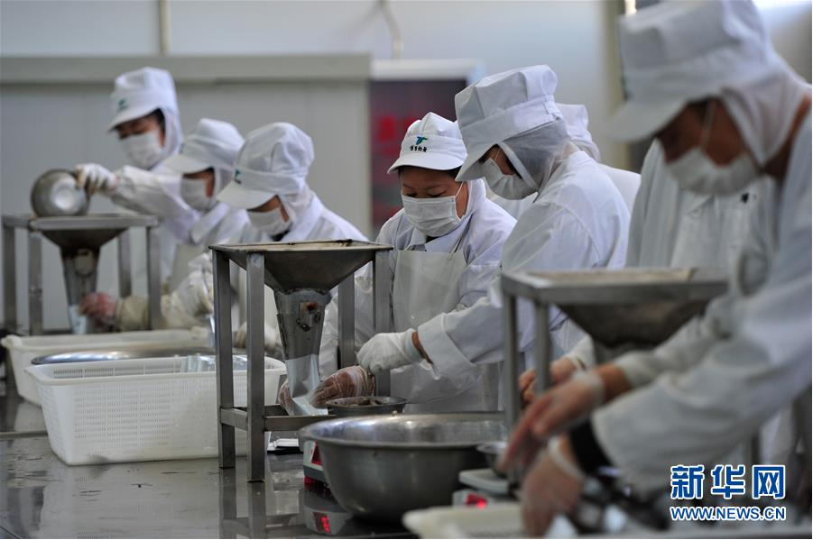 3月10日,工作人员在内蒙古今朝食业有限公司的生产线上加工牛板筋。 新华社记者 连振 摄