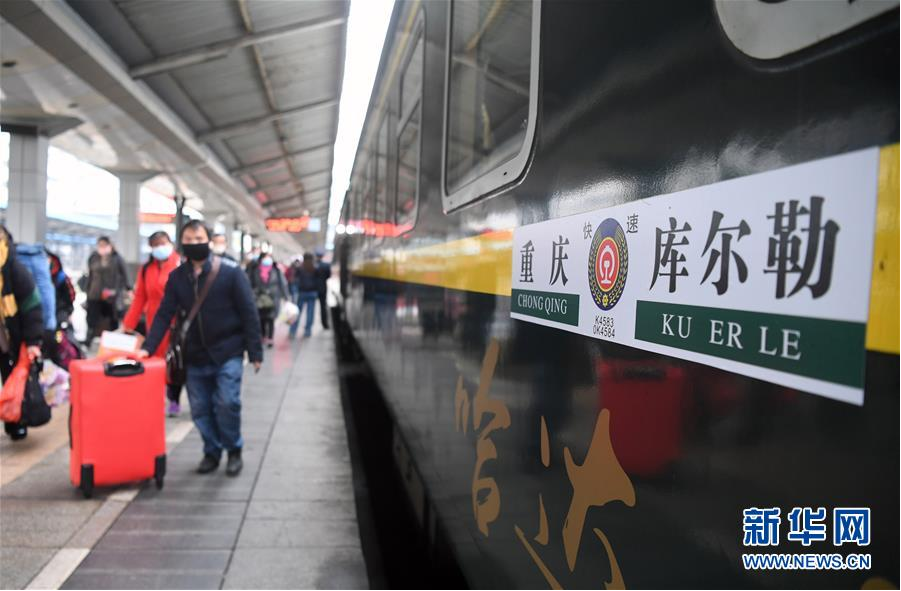 3月17日,新疆兵团职工及家属在重庆站进站上车。为保障复工复产和春耕春种,重庆客运段开行新疆兵团职工返程专列,为新疆兵团在重庆探亲、度假、旅游的职工群众返疆提供便利。新华社记者 唐奕 摄