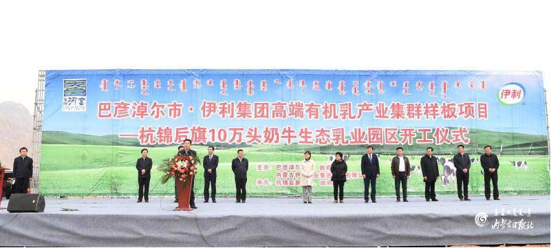 4月18日,巴彦淖尔市•伊利集团高端有机乳产业集群样板项目——杭锦后旗10万头奶牛生态乳业园区开工。自治区党委副书记、自治区主席布小林,自治区副主席艾丽华出席开工仪式。高晓龙摄